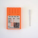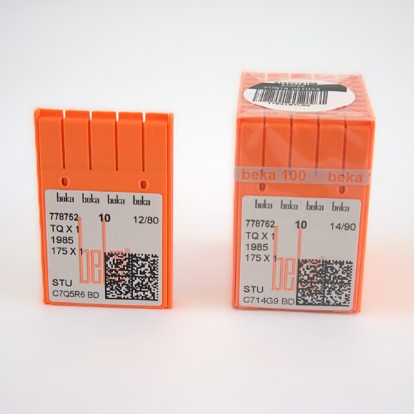 Aguja marca Beka para Botón Plano corresponde al sistema de aguja TQx1 / 1985 / 175X1. Su punta obtusa (STU) está diseñada para coser botones planos con precisión, evitando dañar las fibras del tejido y garantizando costuras firmes y resistentes.