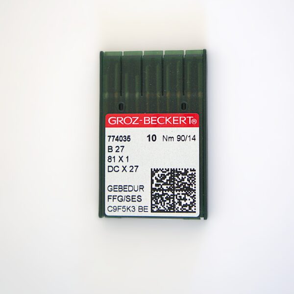 Aguja Dorada Bola Fina Groz-Beckert para Overlock Industrial corresponde al sistema de aguja B27 / 81X1 / DC X 27 GEBEDUR. Su punta bola fina (FFG) está diseñada para coser tejidos delicados y resistentes, garantizando costuras limpias y flexibles.
