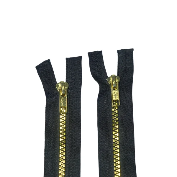 Cierre de plástico resistente y de alta calidad, en color negro con acabado dorado que aporta elegancia y durabilidad. Ideal para chamarras.