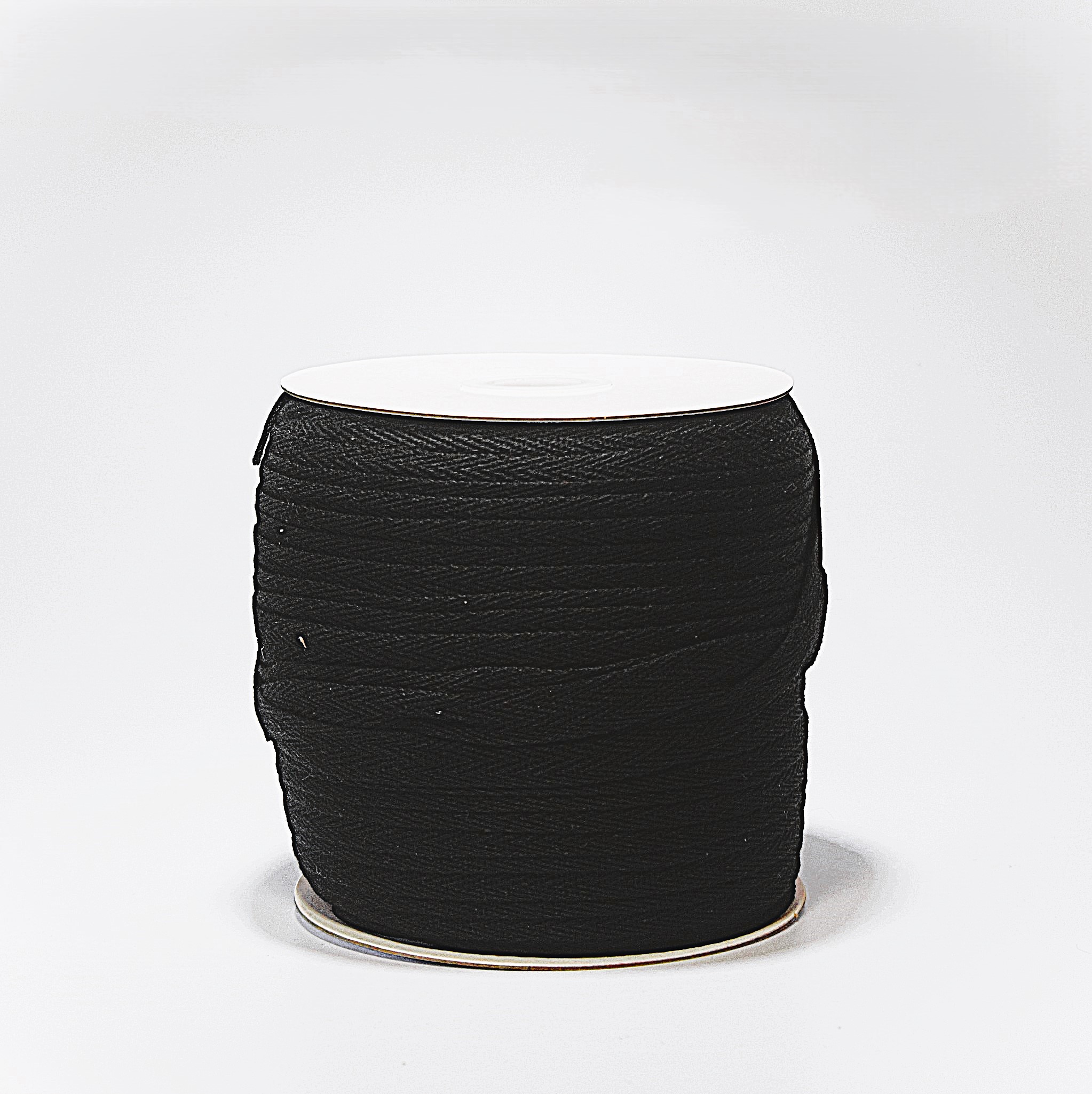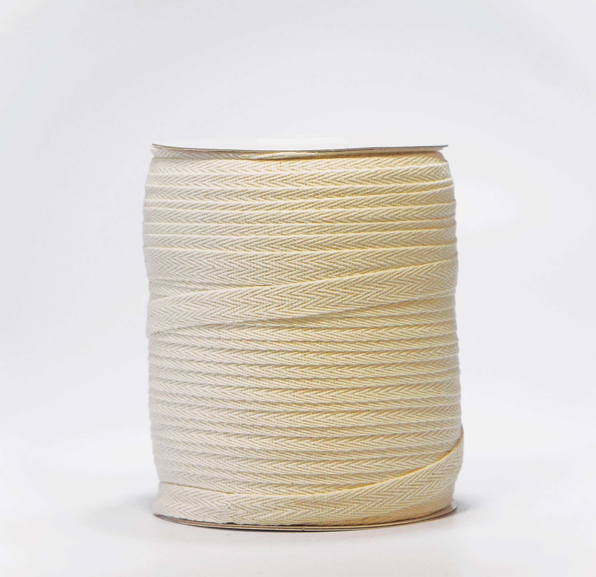 Cinta palmita de excelente calidad. Disponible en: blanco, crudo, punteada marino, negra, punteada negra y punteada roja. Cada rollo contiene 100 metros.