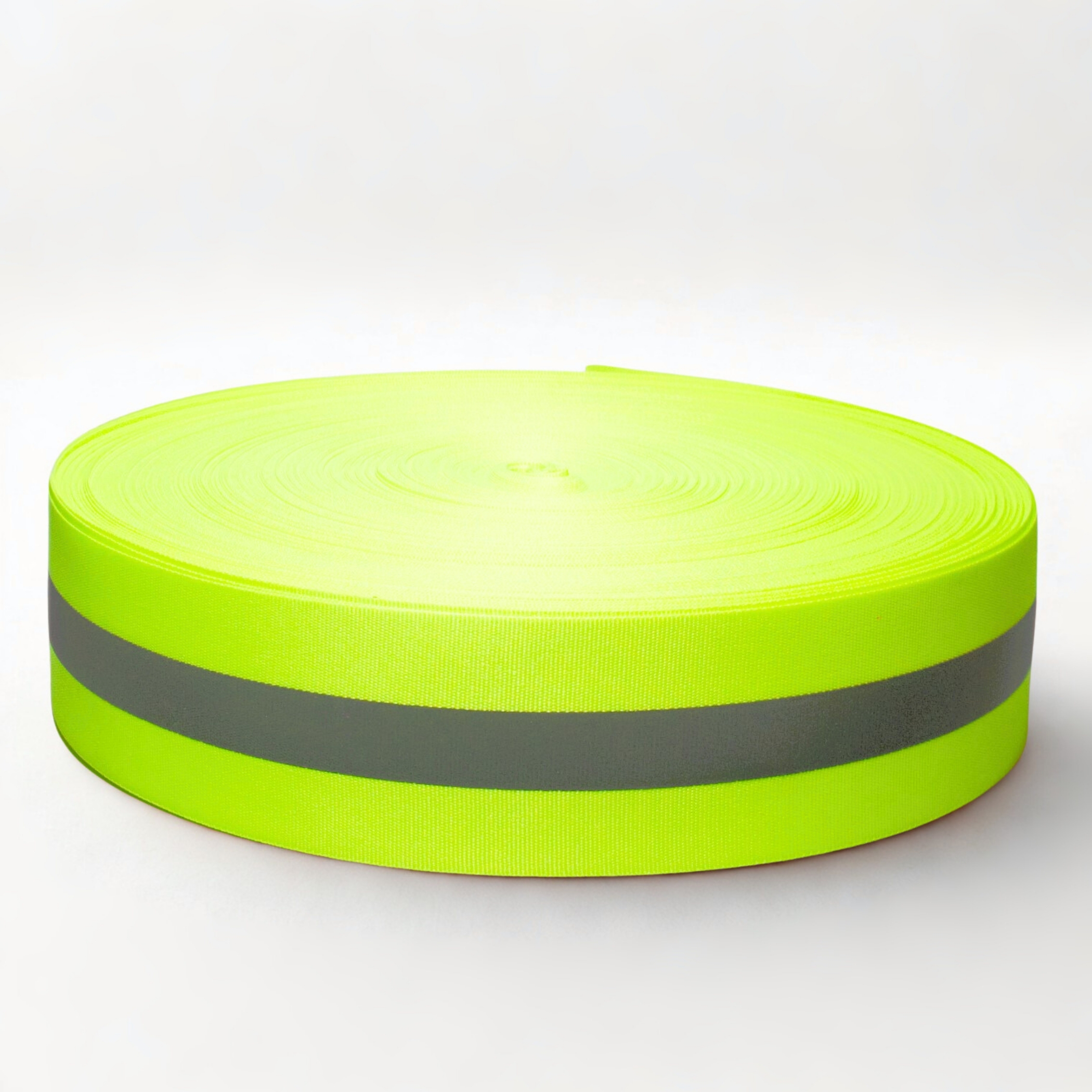 Cinta reflejante de tela en rollo de 100 metros. Disponible en naranja y verde. Fabricada en 100% poliéster de alta calidad.