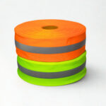 Cinta reflejante de tela en rollo de 50 metros. Disponible en naranja y verde limón. Fabricada en 100% poliéster de alta calidad.