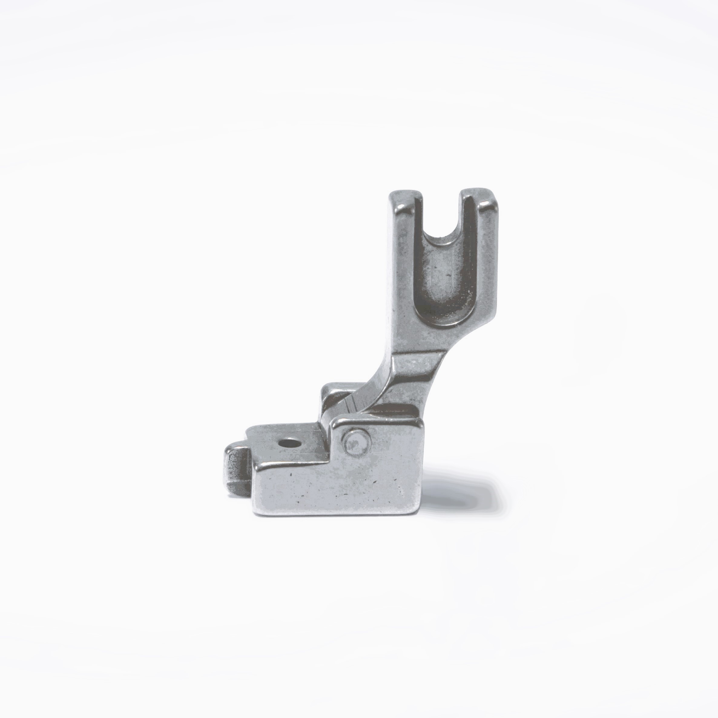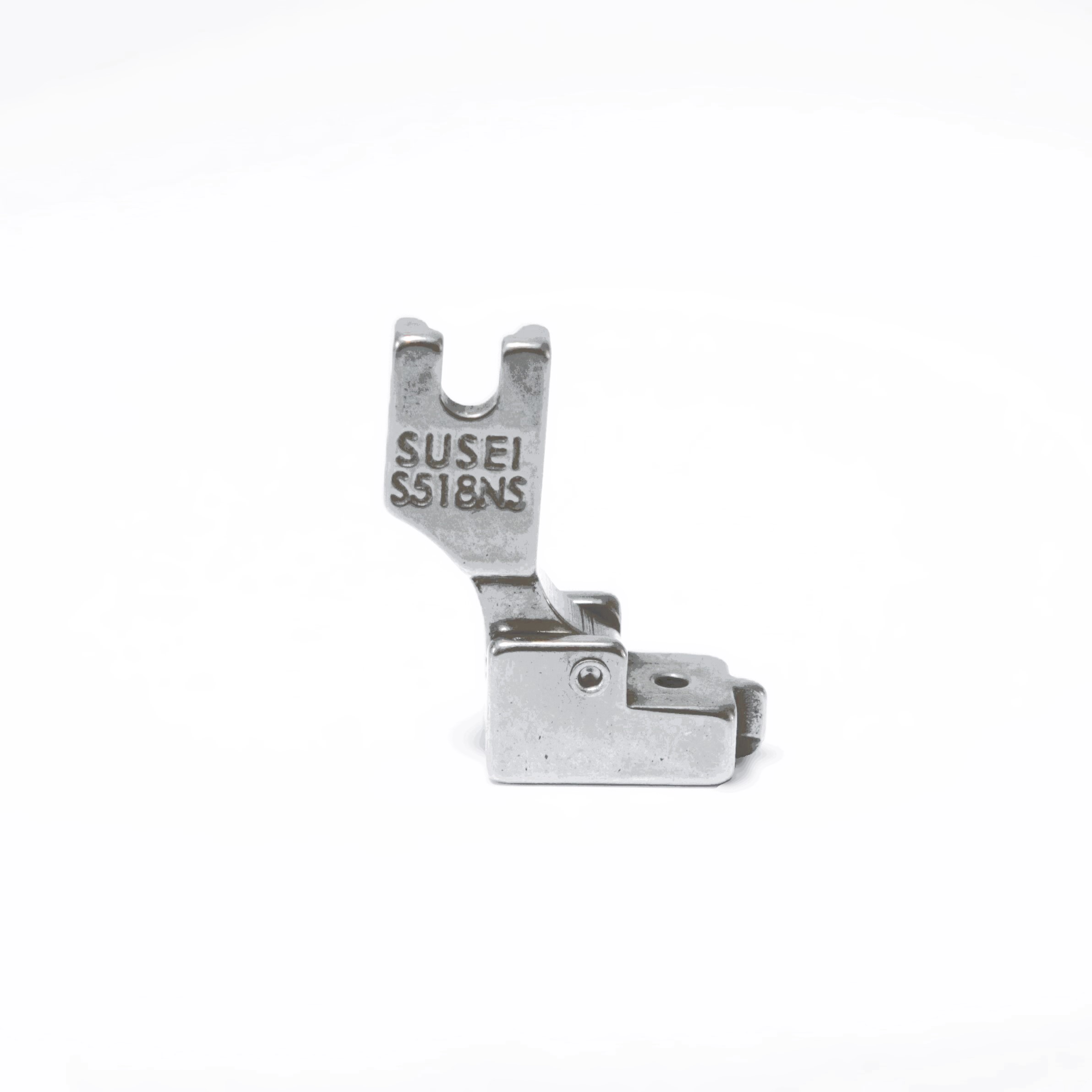 Pie prensatelas modelo S518NS, fabricado en acero de alta resistencia, ideal para coser cremalleras delgadas en máquinas industriales. Su guía permite una costura limpia y cercana al cierre, sin dañar la tela.