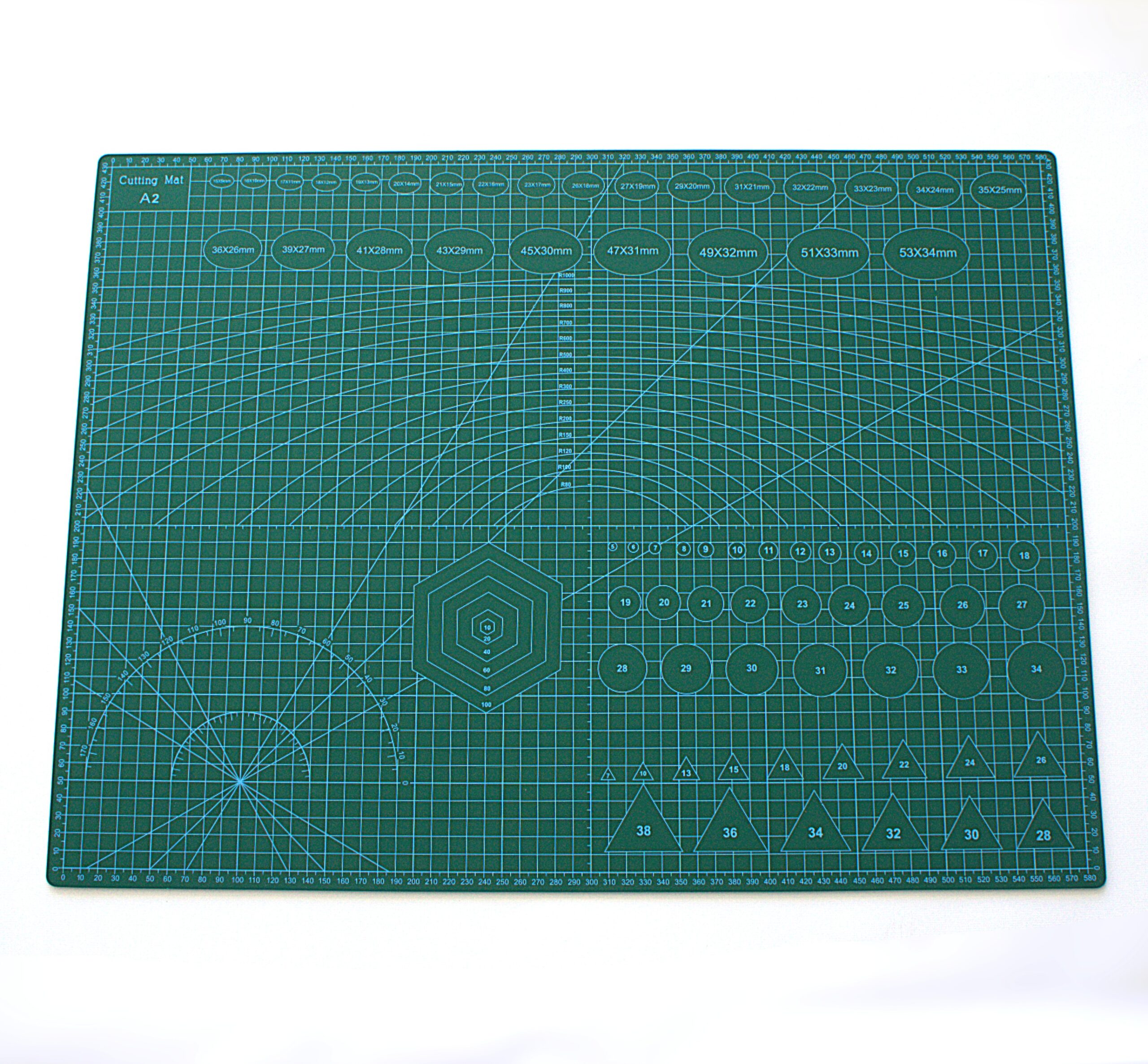 Tapete de corte A2, su tamaño es de 60×45 cm. Herramienta indispensable para talleres de costura, manualidades y diseño. Permite realizar cortes precisos sin dañar la mesa de trabajo.