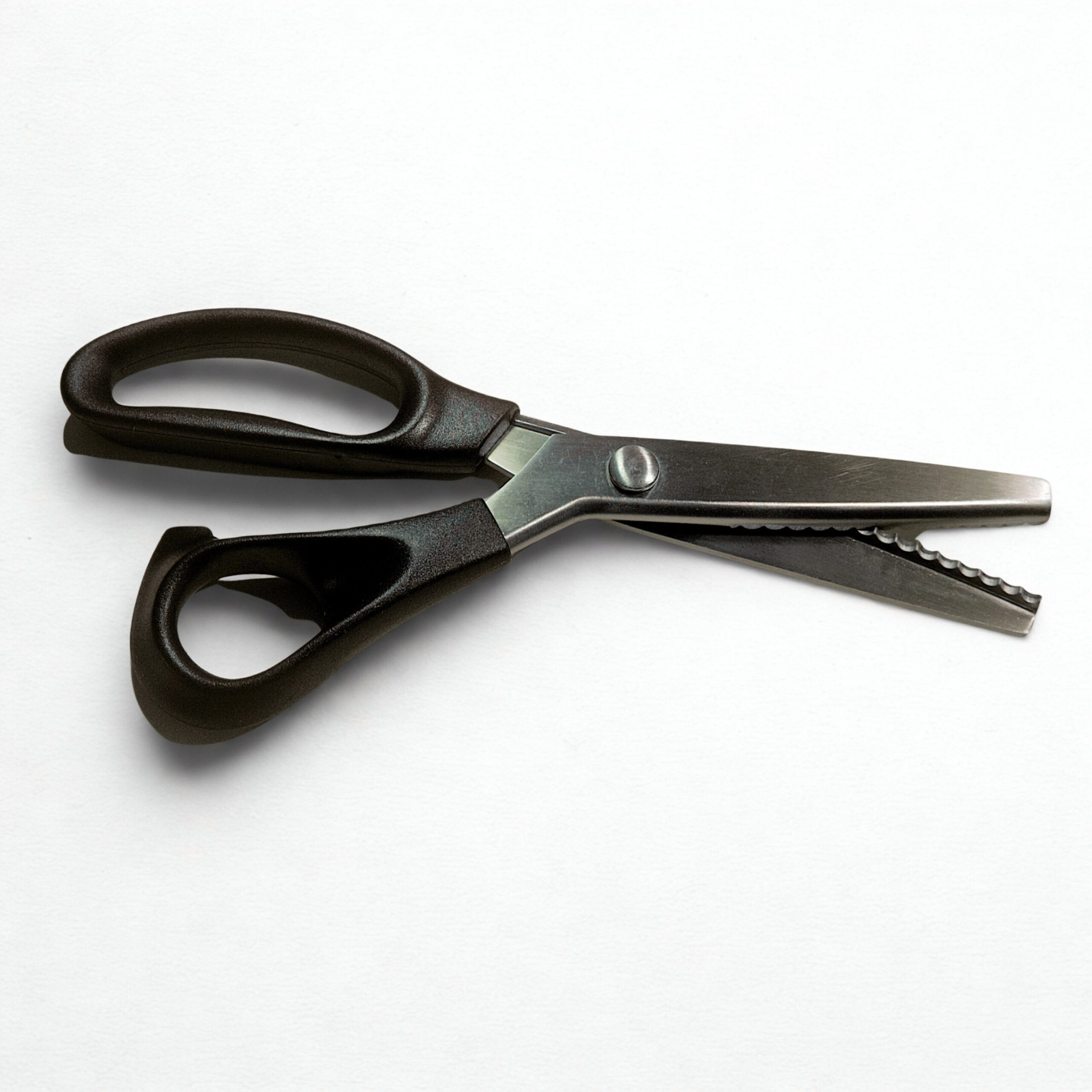 Tijeras con corte en forma de zig zag fabricadas en acero inoxidable para mayor durabilidad, con mango ergonómico de plástico color negro que brinda comodidad y control durante el uso.
